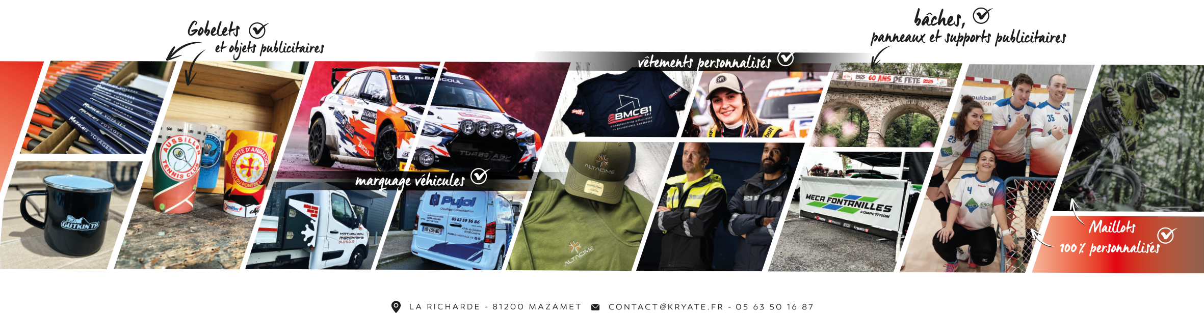 ![]() Kryateest une société Française spécialisée dans la communication visuelle et le textile personnalisé, basée à Mazamet (Tarn, Occitanie). Elle a vu le jour en 2012, portée par une volonté de proposer des solutions de communication adaptée et originales à travers le vêtement et les supports personnalisés. Notre savoir-faire : Valeur ajoutée : ![]() CLUB & ASSOCIATION T-shirt - Polo - Sweat - Jogging - Boxer personnalisés - etc... Contactez nous pour tout vos projets ![]() ![]() DRAPEAUX / BANDEROLES drapeaux / banderoles tissu où bâches publicitaires personnalisés Contactez nous pour tout vos projets CRÉATION DE LOGO refonte ou création Contactez nous pour tout vos projets ![]() CRÉATION VISUELLE Affiches / Flyers / Mise en page Contactez nous pour tout vos projets ![]() ROLL UP Totalement personnalisable Contactez nous pour tout vos projets ![]() OBJETS PUBLICITAIRES Totalement personnalisable Contactez nous pour tout vos projets ![]() TENTES PUBLICITAIRES Totalement personnalisable Contactez nous pour tout vos projets ![]() |